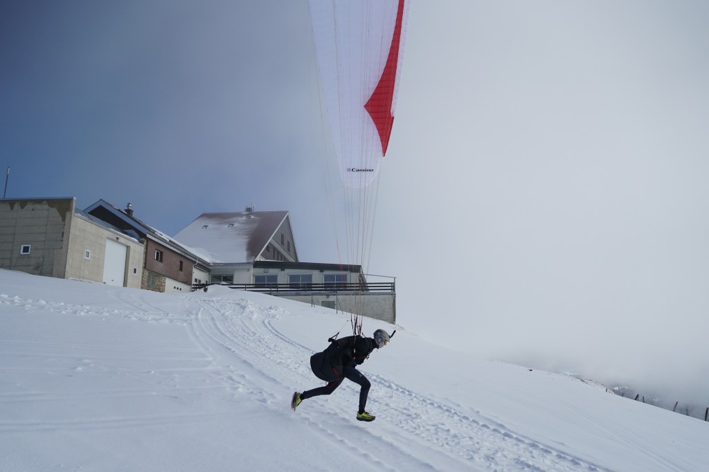 Taking off with the Camino 1 at the Chasseral Hotel ~130 flights: Speed flying/riding license extension in winter 2025 at Birdwing